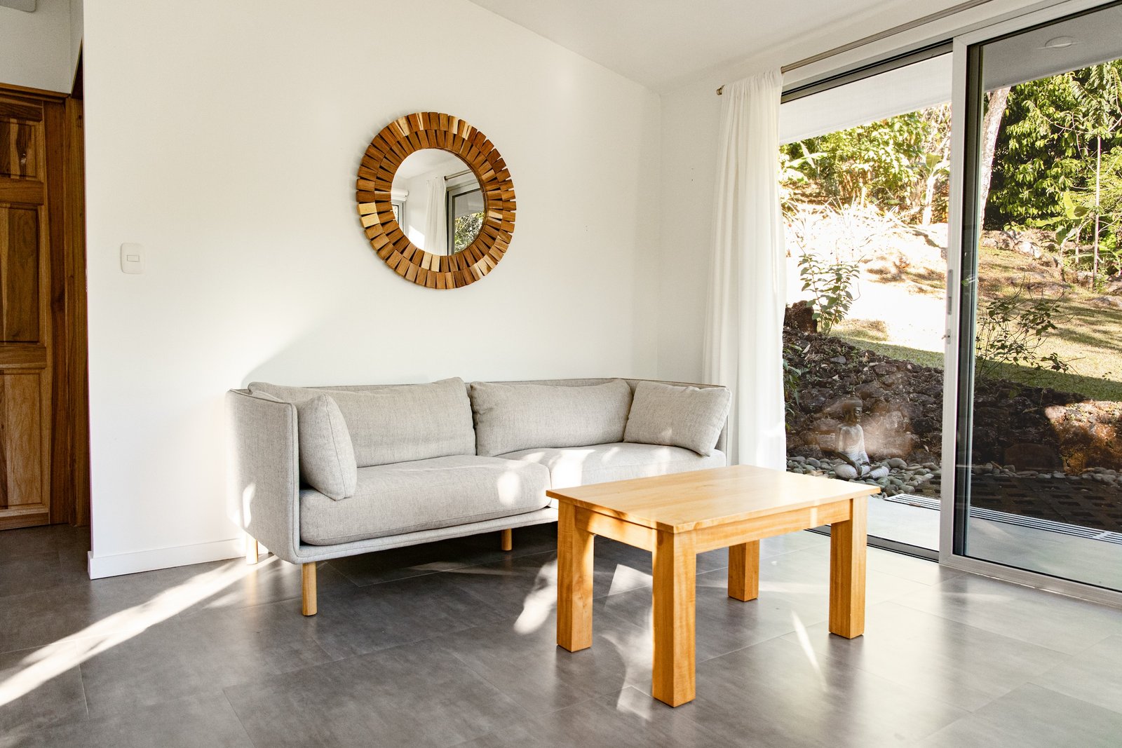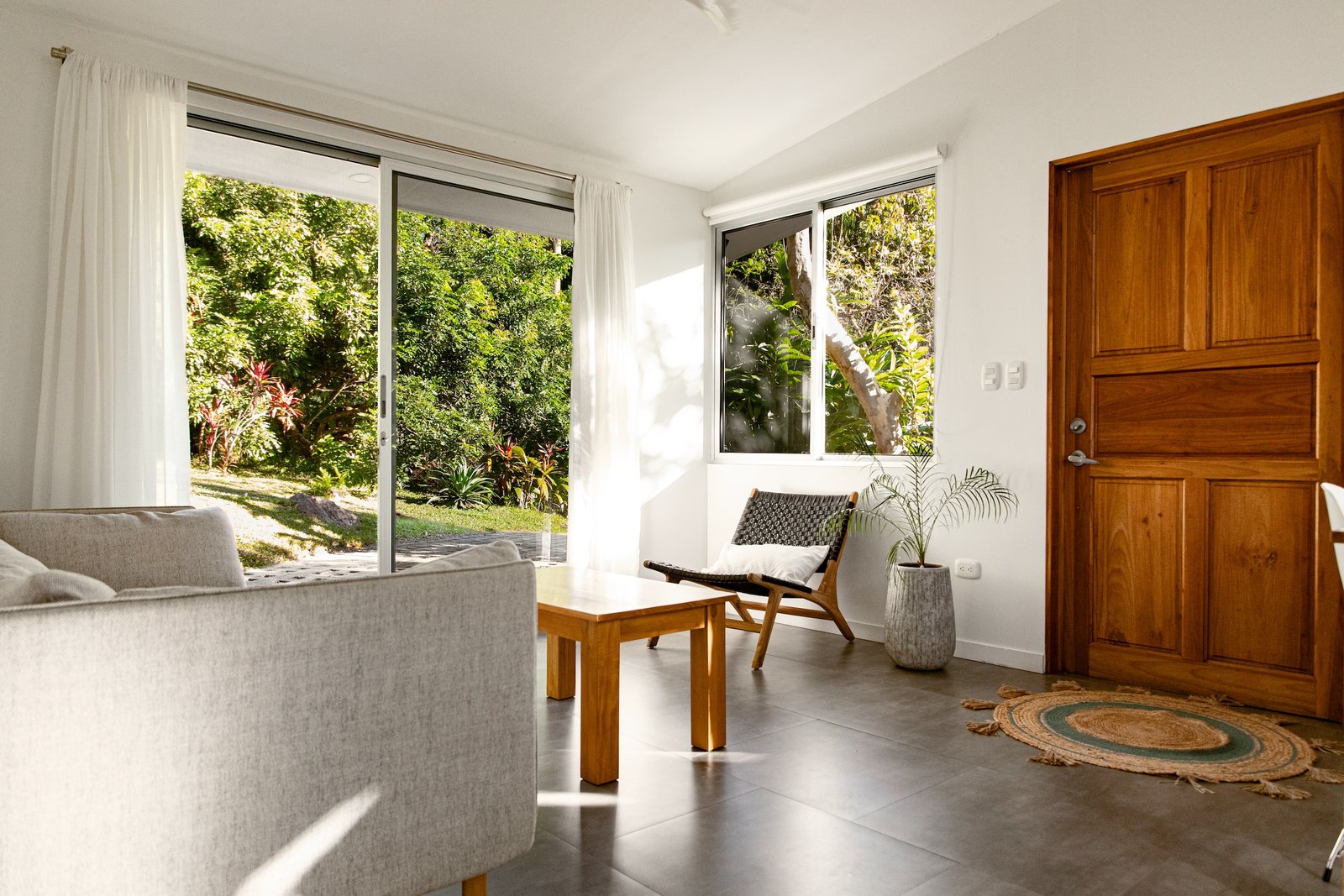El interior blanco, moderno y de estilo escandinavo, con techos altos, llena los espacios de luz natural. Cada mañana te reciben vistas a las montañas, monos aulladores y el canto de los pájaros.